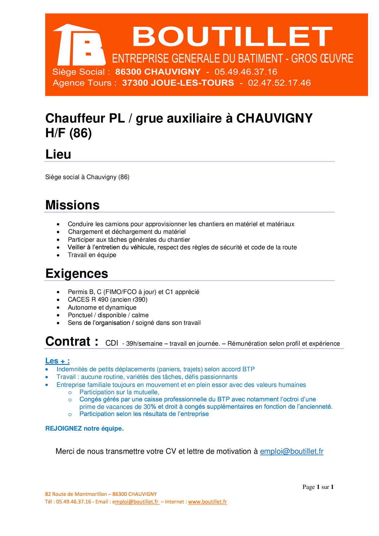 BOUTILLET RECRUTE UN CHAUFFEUR PL / GRUE AUXILIAIRE (H/F) – CHAUVIGNY (86)